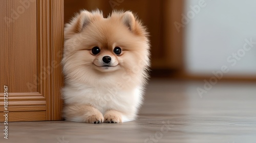 Cute Pomeranian Dog Peeking From Behind Doorway