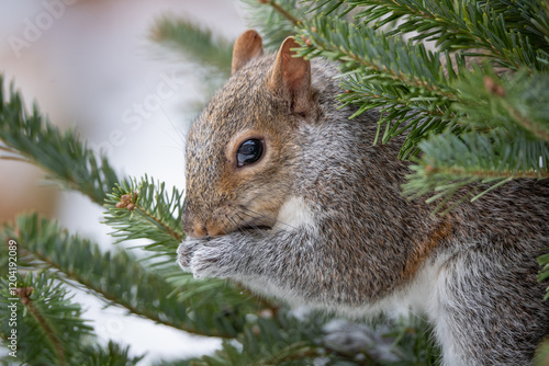 Cute portrait of an Eastern Gray Squirrel (Sciurus carolinesis) sitting in pine tree