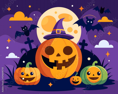 cute poster for a halloween with bats and pumpkins background