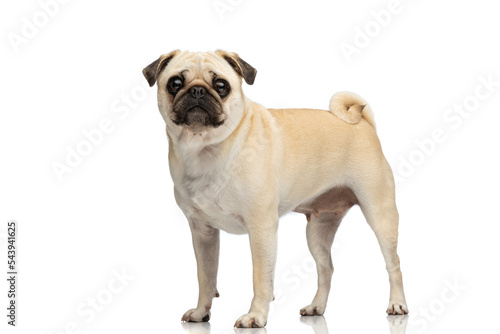 standing, dog, puppy, animal, pet, pug, breed, pedigree, pedigreed, purebred, little, cute, adorable, small, sweet, beautiful, looking, happy, white, studio, background