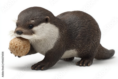 Cute realistic otter holding a round textured ball with detailed fur and lifelike features on a plain white background