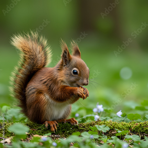 Cute red squirrel, Sciurus vulgaris, eating a nut in a green spring forest with copy space. Lovely wild animal with long ears and fluffy tail feeding in ...