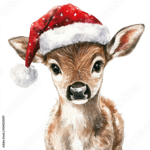 Cute reindeer calf wearing a red Santa hat with a jingle bell, painted in watercolor on an isolated white background. A charming holiday illustration.