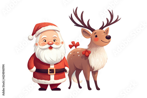 cute santa claus smiling and reindeer, white isolated background,cartoon style PNG