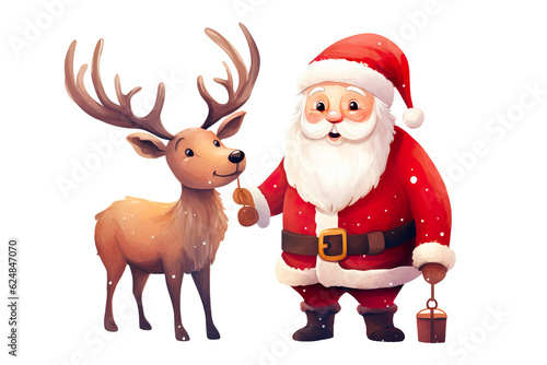 cute santa claus smiling and reindeer, white isolated background,cartoon style PNG