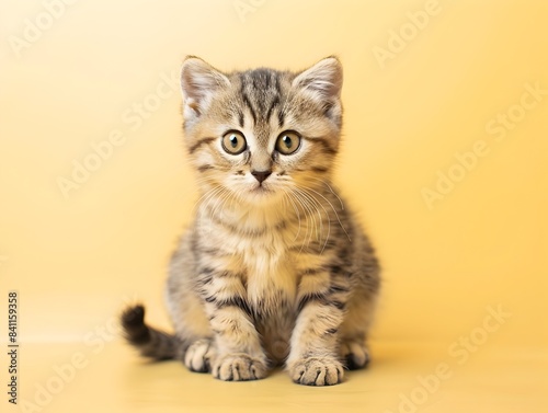 kitten, cat, scottish fold, felino, cute, furry, pet, animal, domestic, small, young, sitting, pose, centered, yellow, pastel, background, clean, minimalist, studio, portrait, closeup, adorable, fluffy, whisker, eye, paw, tail, cosy, playful, meow, cat, fuzzy, cuddly, soft, whisker, paw, tabby, tiny, baby animal, baby, innocent, curious, wide-eyed, alert, gentle, friendly