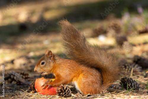Cute scottish red squirrel eating a tasty apple in the woodland