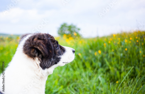 cute shepherd dog puppy on green meadow - happy pet outdoors