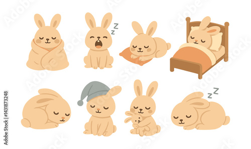 Cute sleepy bunny icons set: cozy bedtime bliss in charming flat style. Vector icons