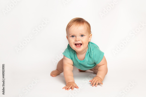 Cute small caucasian toddler baby boy child crawl on white studio floor. Smiling little infant kid wearing a green t-shirt explore world. Childcare and upbringing concept.