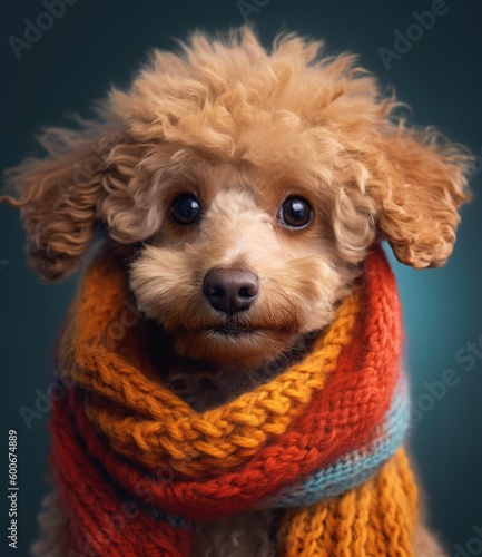 cute smiling Toy Poodle with scarf in a grey background, portrait created by generative AI technology.