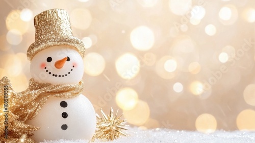 Cute snowman with a golden top hat and scarf, surrounded by shimmering golden bokeh lights, evokes a magical winter atmosphere perfect for holiday celebrations and seasonal greetings.