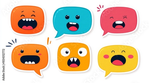 emoticon, speech bubble, cartoon, character, cute, funny, happy, excited, surprised, shocked, angry, sad, illustration, design, graphic, vector, art, digital artwork, sticker, communication, expression, feeling, emotion, symbol, icon, set, collection, white background, isolated, colourful, bright, cheerful, vibrant, playful, whimsical, fun, casual attire, friendly, positive, expressive