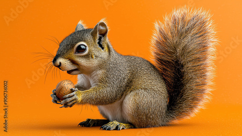 Cute squirrel clutching a nut, set against a bright orange background, showcasing a moment of curiosity and charm.