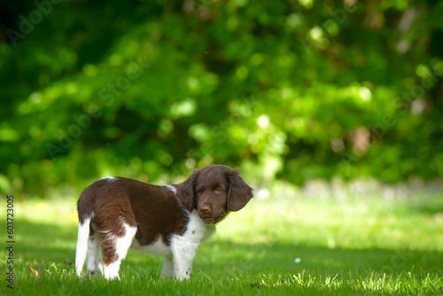 Cute stabyhoun puppy on a green lawn near a forest in the spring