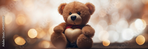 Cute teddy bear sitting with heart in a cozy, sparkling background