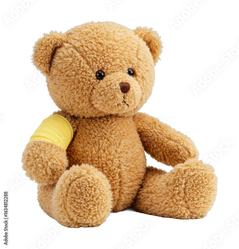 teddy, bear, bandaged, arm, cute, plush, toy, stuffed, soft, brown, cuddly, seated, childish, furry, adorable, cosy, healing, comfort, children, hugging, relaxed, friendly, gentle, playful, classic, timeless, comforting, warm, sweet