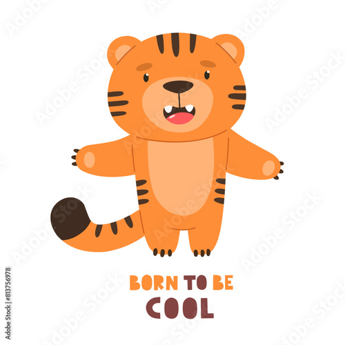 Cute tiger cub with the text Born to be cool. Vector character, children's print.