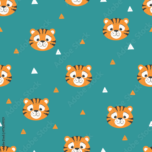 tiger, cute, baby, pattern, character, cartoon, print, seamless, background, vector, children, design, textile, fabric, childcare center, texture, cat, funny, little, head, face, animal, illustration, graphic, doodle, hand, drawn, ornament, wallpaper, paper, zoo, wild, safari
