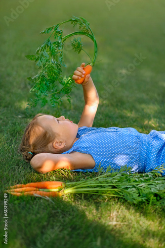 Cute toddler is lying peacefully calmly on the lawn grass and carelessly nibbling fresh juicy sweet carrots. Vegetarian children's menu rich in vitamins A, minerals and carotene