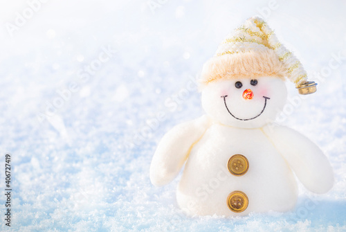 snowman, toy, snow, plain, winter, cold, frost, sunlight, greeting card, closeup, one object, horizontal, no people, copy space, plush, season, day, snowfall, holiday, celebration, christmas, christmas card, cute, happy, white, hat, smile, nature, outdoors, glacé