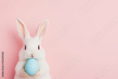 Cute white bunny holding a pastel blue egg on a soft pink background, perfect for Easter themed designs and spring celebrations