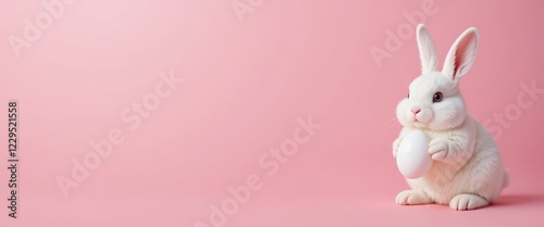 Cute white bunny holding an egg on pastel pink background. Banner. Copyspace
