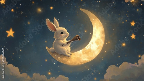 rabbit, rabbit, moon, crescent, night, starry, star, sky, playing, trumpet, cute, animal, white, illustration, fairy tale, dream, magic, fantasy, childhood, whimsical, imagination, art, drawing, digital, design, character, adorable, fluffy, happy, peaceful