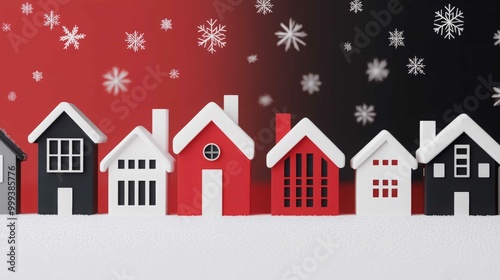 Cute winter scene featuring colorful houses on a snow-covered ground, accented by falling snowflakes against a striking red and black background.