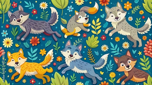 wolf, cute, animation, illustration, playful, design, toy, sleeping, jumping, hugging, running, sitting, colourful, whimsical, print, decor, animal, character, fun, happy, friendly, nature, art, creativity, childhood, joy, fantasy, childcare center, pattern, storytelling, adventure, imagination, cheerful, vibrant, lovely, graphic, sketch, adorable, wildlife, enchanting, happiness, softness, charming, delightful