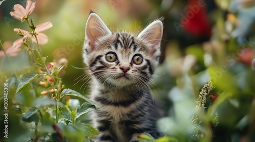cute young kitten sitting in a lush green garden surrounded by nature with soft fur and whiskers enjoying a relaxing and cozy outdoor experience