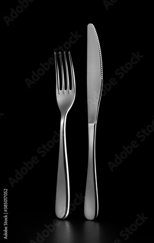 Cutlery set. Fork, knife. Isolated on black background.