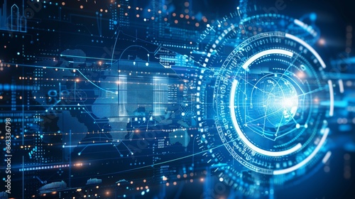 Cutting edge personal computer in futuristic environment against a vibrant blue backdrop