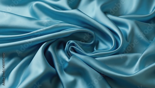 Cyan blue satin fabric displays luxurious shiny smooth texture. Elegant material with abstract wave pattern creates a soft, flowing drape, ideal for fashion, banners, business designs.