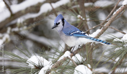 Cyanocitta Cristata Serenity. Blue Jay Bird in Winter Wonderland, Northern Ontario Provincial Park Delight
