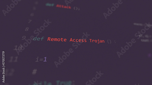Cyber attack remote access trojan vunerability in text ascii art style, remote trojan code on editor screen.