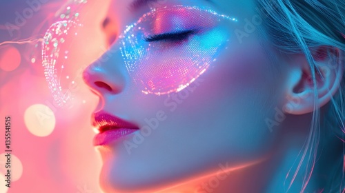 neon, cyber, digital artwork, woman, closed eyes, face, abstract, futuristic, modern, dreamscape, aethereal, glowing, colourful, vibrant, illumination, fantasy, beauty, imagination, technology, portrait, artistic, female, profile, innovation, creative, design, glow, art, light, person, skin, soft, elegance, style, pretty, vision, inspiration, future, cosmic, surreal, magic, render, digital, bokeh, composition, aura, consciousness