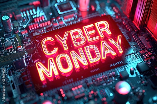 CYBER MONDAY neon glowing text on a computer motherboard. Black friday and sale on electronic goods concept. Generative Ai
