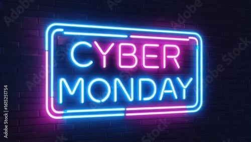Cyber monday neon sign with pink and blue lights on a brick wall for advertising and promotion