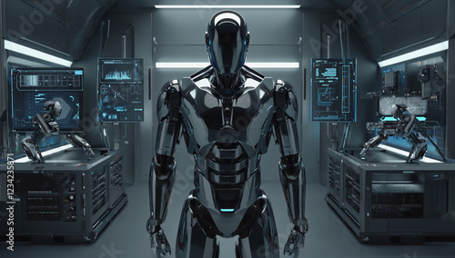 robot, android, futuristic, technology, cyborg, artificial intelligence, ai, science fiction, science fiction, laboratory, high technology, equipment, metallic, polished, sleek, sentinel, dramatic, atmosphere, digital, machine, automation, innovation, computer, screen, display, control panel, interface, modern, advanced, digital artwork, cybernetic, robotic, machinery, dark, mysterious, technically, progress, future, research, development