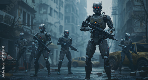 Cybernetic troops of tactical combat humanoid robots, preparing for urban warfare operations, background wallpaper.