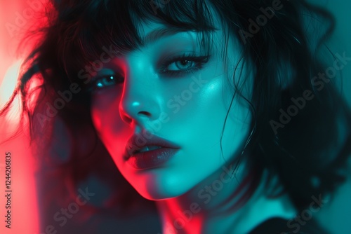 aesthetic, neon, futuristic, science fiction, digital, urban, technology, glowing, city, innovation, cyber, high technology, surreal, electronic, modern, abstract, virtual, artistic, vibrant, dynamic, conceptual, woman, beauty, hair, fashion, model, face, make-up, lip, glamour, make-up, eye, red, black, long, brunette, person, coiffure, studio, up, people, redhead, skin, closeup