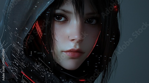 woman, girl, futuristic, portrait, digital, art, technology, science, fiction, fantasy, anime, manga, hood, face, eye, hair, expression, serious, intense, red, black, dark, glowing, line, illustration, artwork, graphic, design, neon, cyber, future, modern, stylish, cool, aesthetic, female, person, human, model