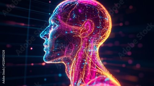 Cyberpunk-style anatomy illustration of the human neck, with intricate muscle strain mapping in vibrant holographic layers, set against a high-tech digital grid background