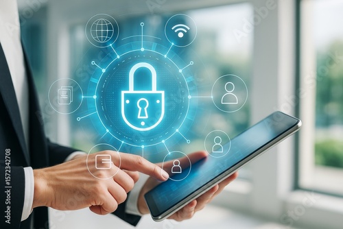 Cybersecurity concept showing digital padlock icon above tablet held by businessman, symbolizing data protection and secure network access.