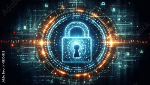 Cybersecurity concept with a glowing digital padlock overlaid on a background of binary code