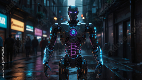 cyborg, robot, android, futuristic, city, city landscape, night, dark, urban, technology, science, fiction, future, metropolis, skyscraper, building, industrial, artificial, intelligence, machine, metal, red, eye, human, head, silhouette, background, scene, view, landscape, digital, art, illustration, concept, design, graphic, image, photo, picture, artwork, visual