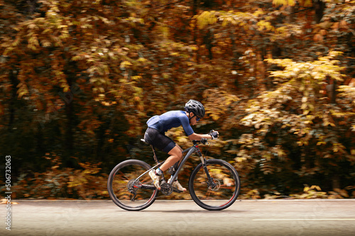 Cycling training, Cyclist speeding mountain bike on road with autumn forest side. Outdoor sport activity fun and enjoy riding. Basic techniques training on trail of athletes. Focusing on cyclist