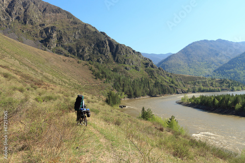 man, person, people, caucasian, 1, senior, adult, elderly, old, bicyclist, traveler, holiday maker, tramp, voyager, active, going, road, way, footpath, path, bicycle, cycle, bike, backpack, mountain, top, rock, river, coast, tree, grass, sky, travel, campaign, landscape, nature, rest, scenic, horizon, leisure, lifestyle, health, recreation, tour tourism, copy space