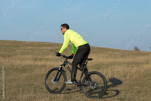 Cyclist in pants and green jacket on a modern carbon hardtail bike with an air suspension fork. The guy on the top of the hill rides a bike.